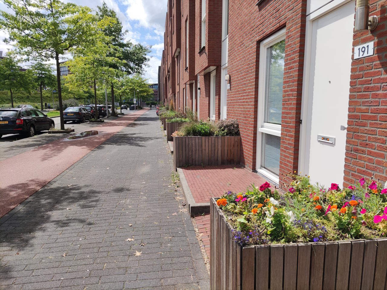 Op Burendag in september 2021 timmerden ze samen met de bewoners van blok 1 (huisnummers 167 t/m 185) 11 plantenbakken. Deze plaatsten zij op en om de betonnen blokken, die de afscheiding tussen de stoepen vormen. Vervolgens plantten zij hierin een mengsel van vaste planten en een enkele klimmer.