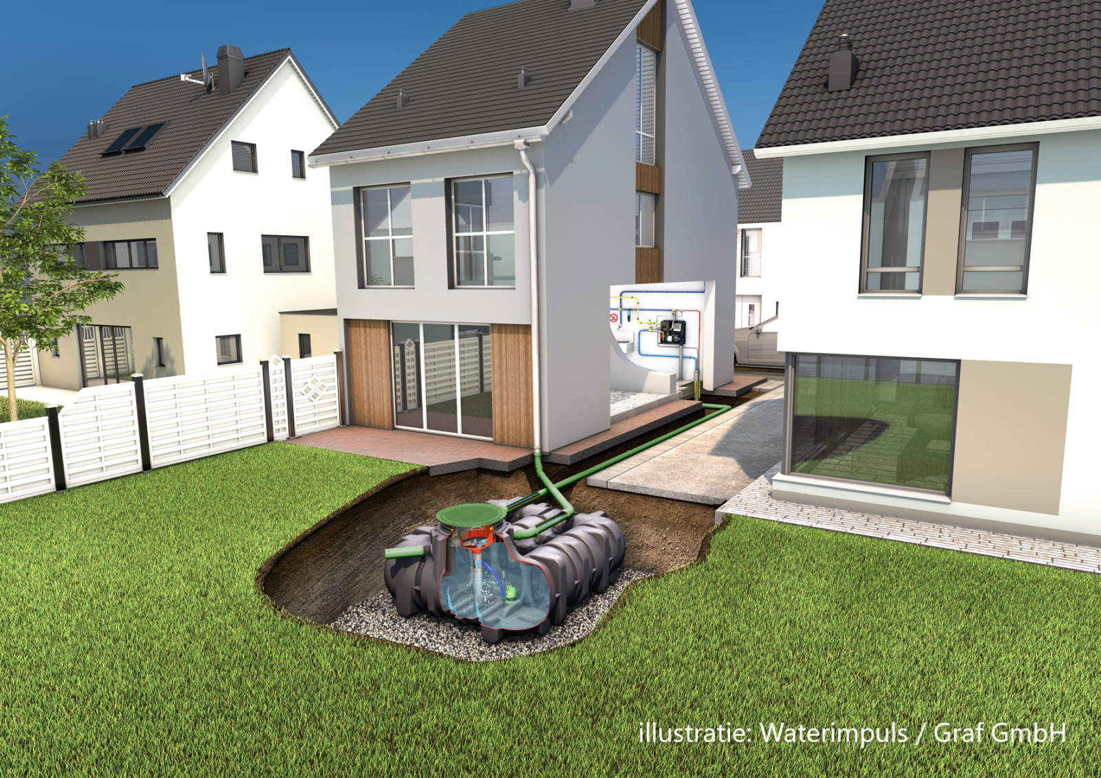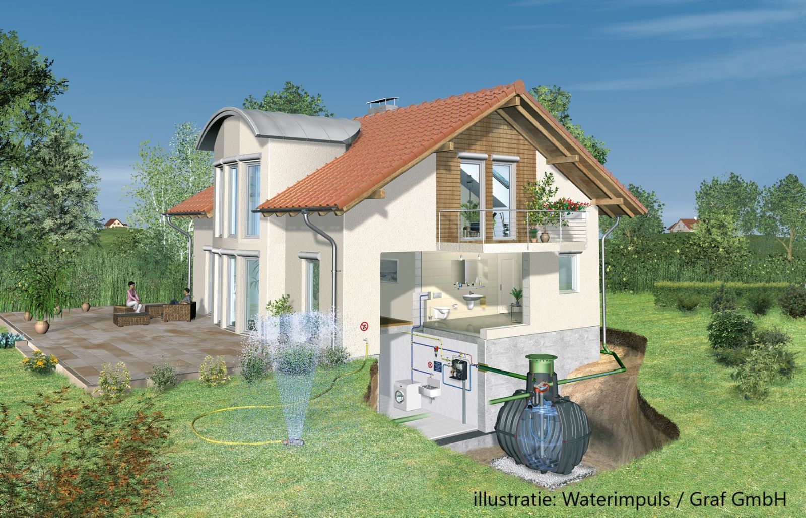 Een regenwatergebruikssysteem bespaart drinkwater en houdt regenwater vast. Dit regenwater kan gebruikt worden voor de wasmachine, de wc en de tuin.