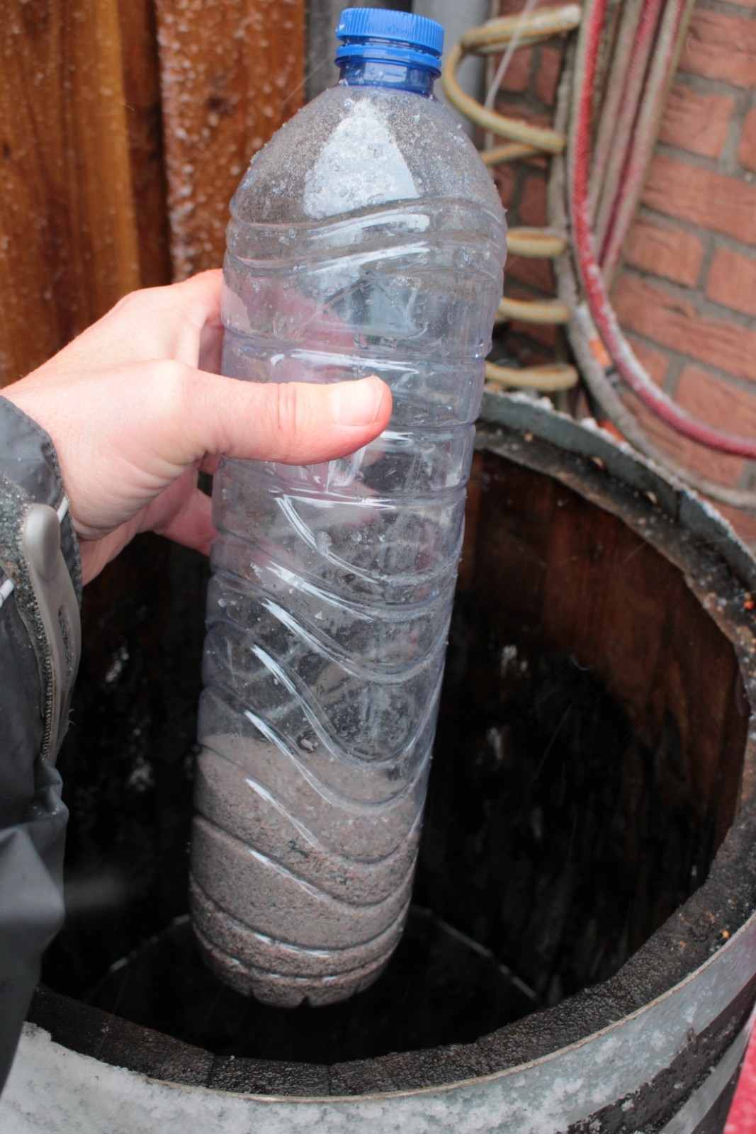 - Een andere methode is om een aantal plastic flessen gedeeltelijk te vullen met zand en deze in de ton te laten drijven; de flessen vangen de druk op die ontstaat als het water bevriest, waardoor de ton niet barst.