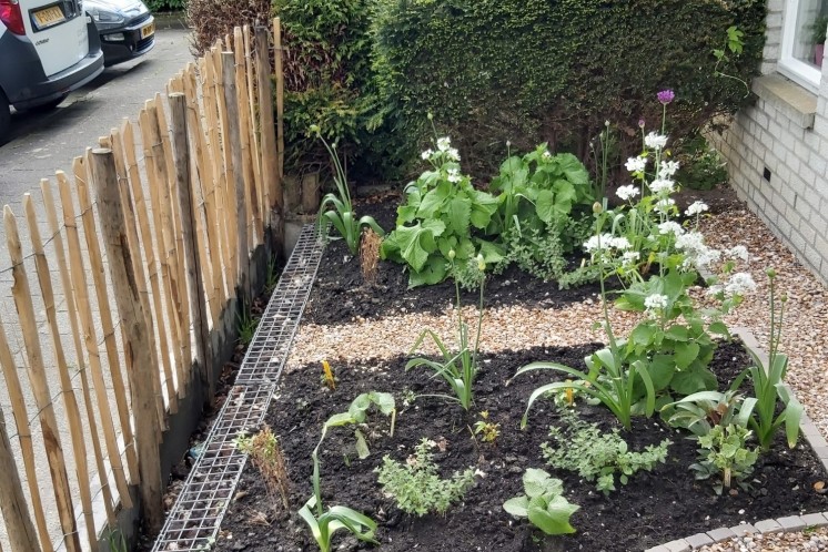 Samen met de buren hebben Jaap en Marlies van hun bestrate voortuin een groene tuin gemaakt door de stenen eruit te halen en een wadi aan te leggen.
