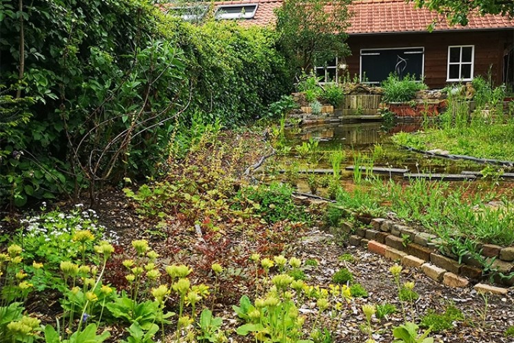 Hans en Wilma hebben een ecologische tuin waarin ze werken volgens permacultuur principes. Dit betekent zoveel mogelijk hergebruik van materiaal, benutting van regenwater, verschillende leefomgevingen voor dieren in de tuin en het gebruik van inheemse (eetbare) planten, struiken en bomen.