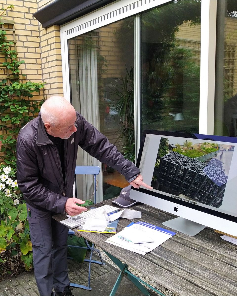Theo van de voorbeeldtuin op de Mezekouw gaf nog een presentatie over de aanleg. Deze tuin met ondergrondse infiltratie was uiteraard in totaal contrast met de andere tuinen met wadi's.
