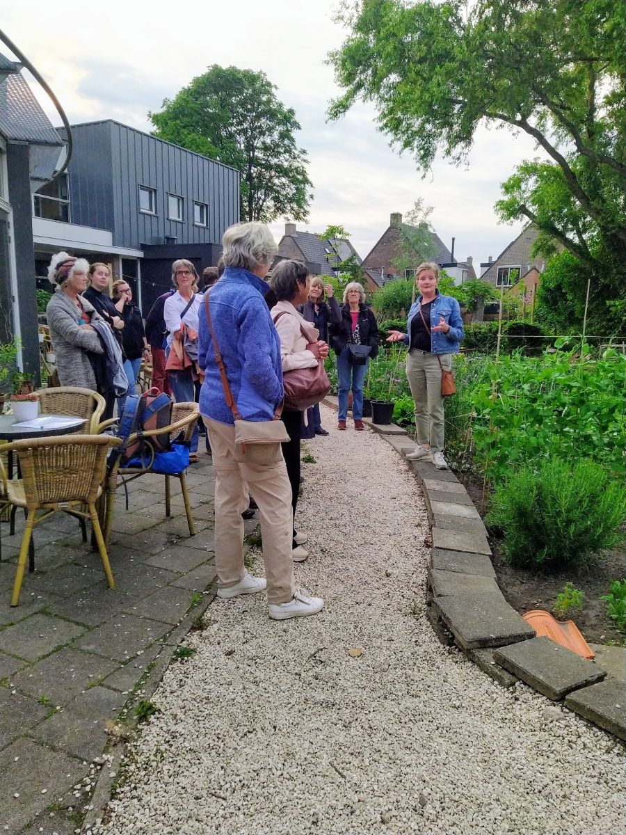 Marieke van der Zeijden vertelde over de klimaatadaptieve tuin bij Huis Miereveld, waarna de groep onder leiding van Anneke Beemer de wijk in ging om andere inspirerende tuinen te bekijken. Marjan Jordan liep ook mee, buurtbewoner en wildplukster, deelde haar kennis over eetbare planten en inspireerde de deelnemers met haar verhalen. Tijdens de wandeling werden praktische tips gegeven en vragen beantwoord over onder andere tuinonderhoud, eetbaar 'onkruid', ontstenen en het vergroten van de biodiversiteit in jouw tuin. Ook het onderwerp invasieve exoten kwam tijdens de wandeling ter sprake. Het recente nieuws over de invasieve vlinderstruik zorgde ook voor gespreksstof onder de deelnemers.